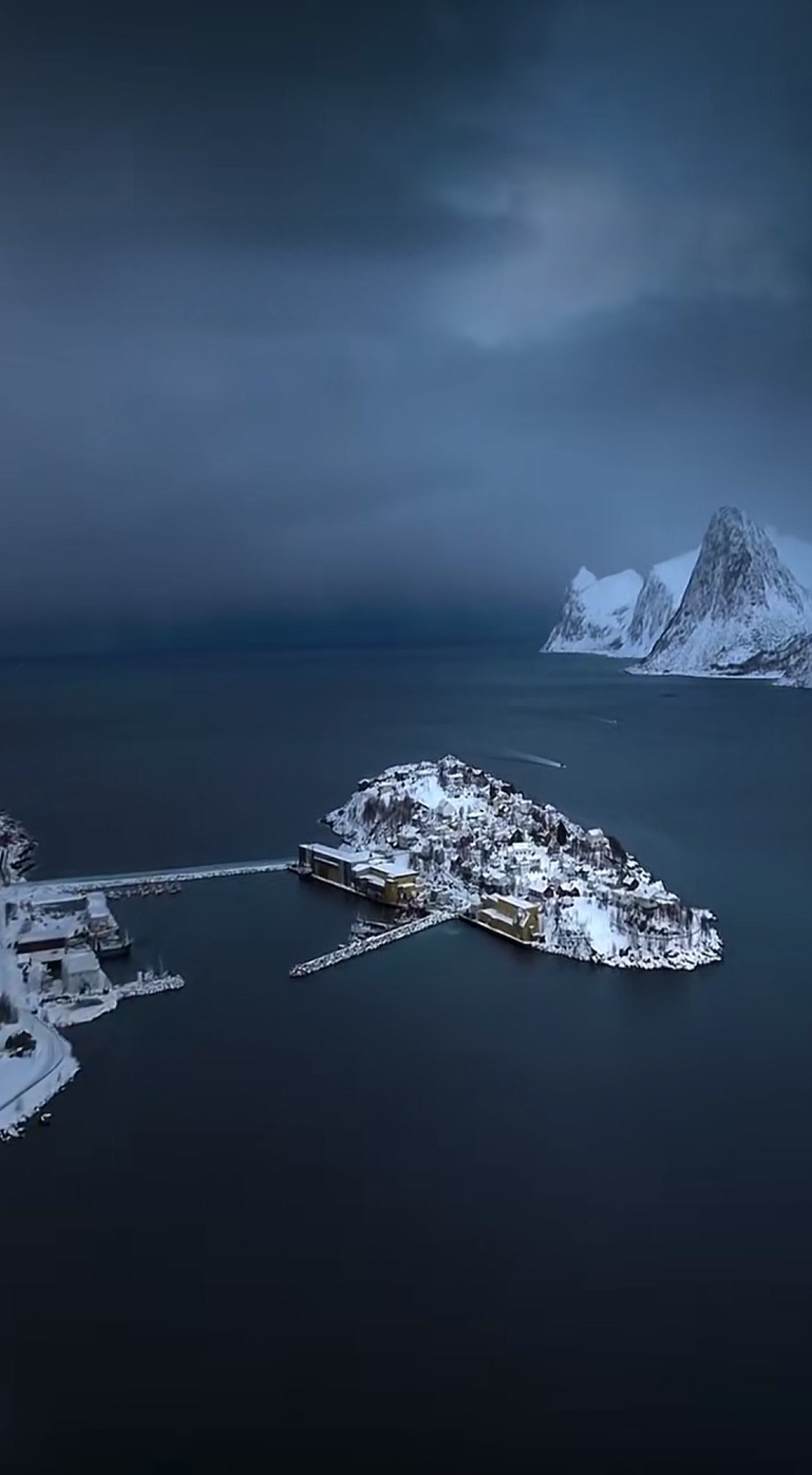 2. 피오르와 산맥의 조화: 솜마뢰이는 본토와 다리로 연결된 크발뢰위(Kvaløya, 고래 섬) 섬 옆에 자리 잡고 있으며, 주변으로는 노르웨이의 상징인 **피오르(Fjord)**가 깊숙이 들어와 있습니다. 푸른 바다와 날카로운 산봉우리가 어우러진 드라마틱한 풍경은 트롬쇠에서 솜마뢰이로 향하는 길 자체가 하나의 장엄한 관광 코스가 되게 합니다. 서쪽으로는 센야(Senja) 섬의 푸른 산맥이 장엄한 배경을 형성합니다.