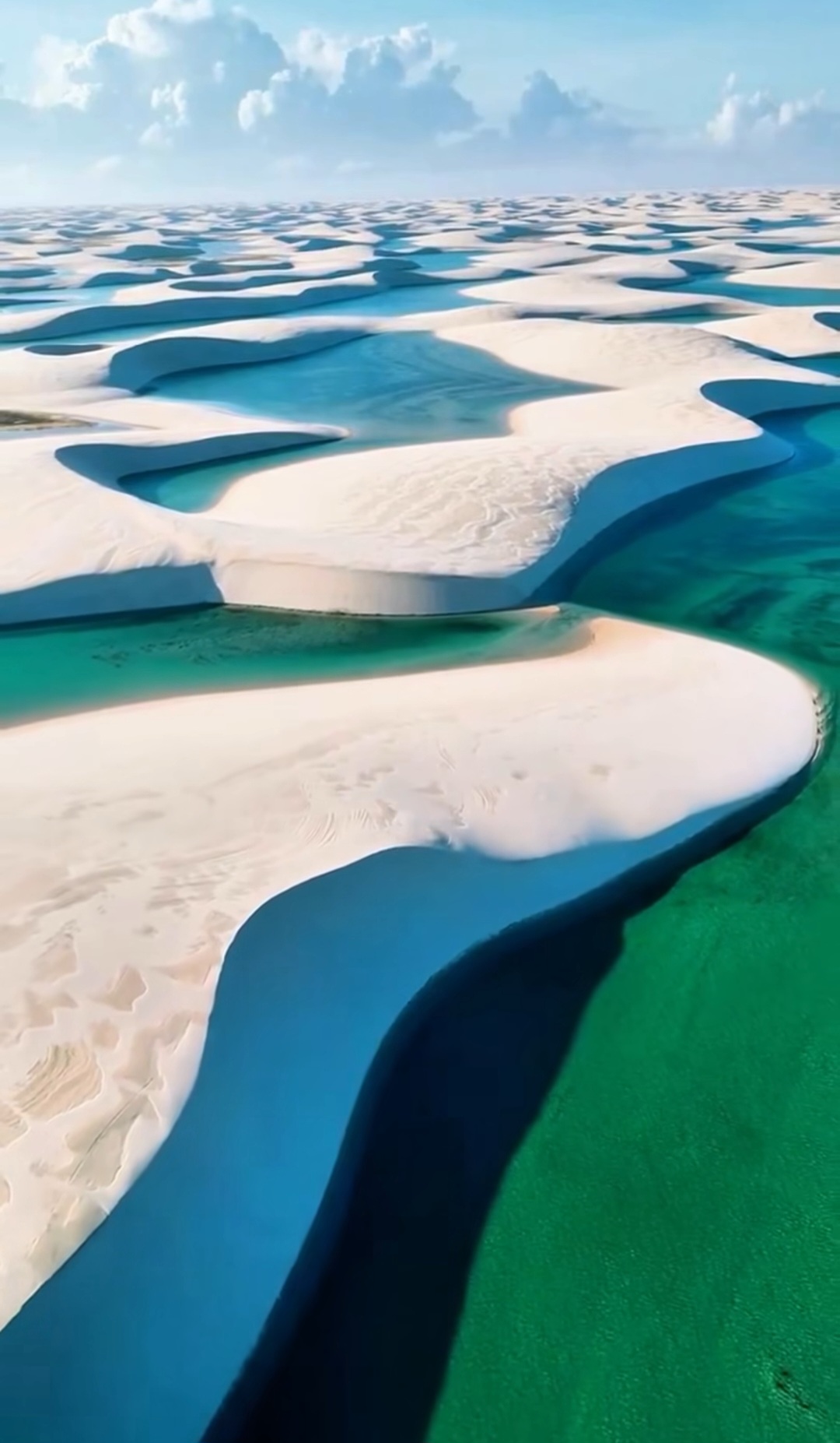 브라질 북동부 마라냥(Maranhão) 주 해안에 위치한 **렌소이스 마라냥스 국립공원(Parque Nacional dos Lençóis Maranhenses)**은 지구상에서 가장 독특하고 초현실적인 자연 경관을 자랑하는 곳입니다. '렌소이스(Lençóis)'는 포르투갈어로 **'침대 시트'**라는 뜻을 가지고 있으며, 그 이름처럼 끝없이 펼쳐진 하얀 모래 언덕(사구, Dune)들이 마치 새하얀 천을 펼쳐놓은 듯한 모습을 하고 있습니다.