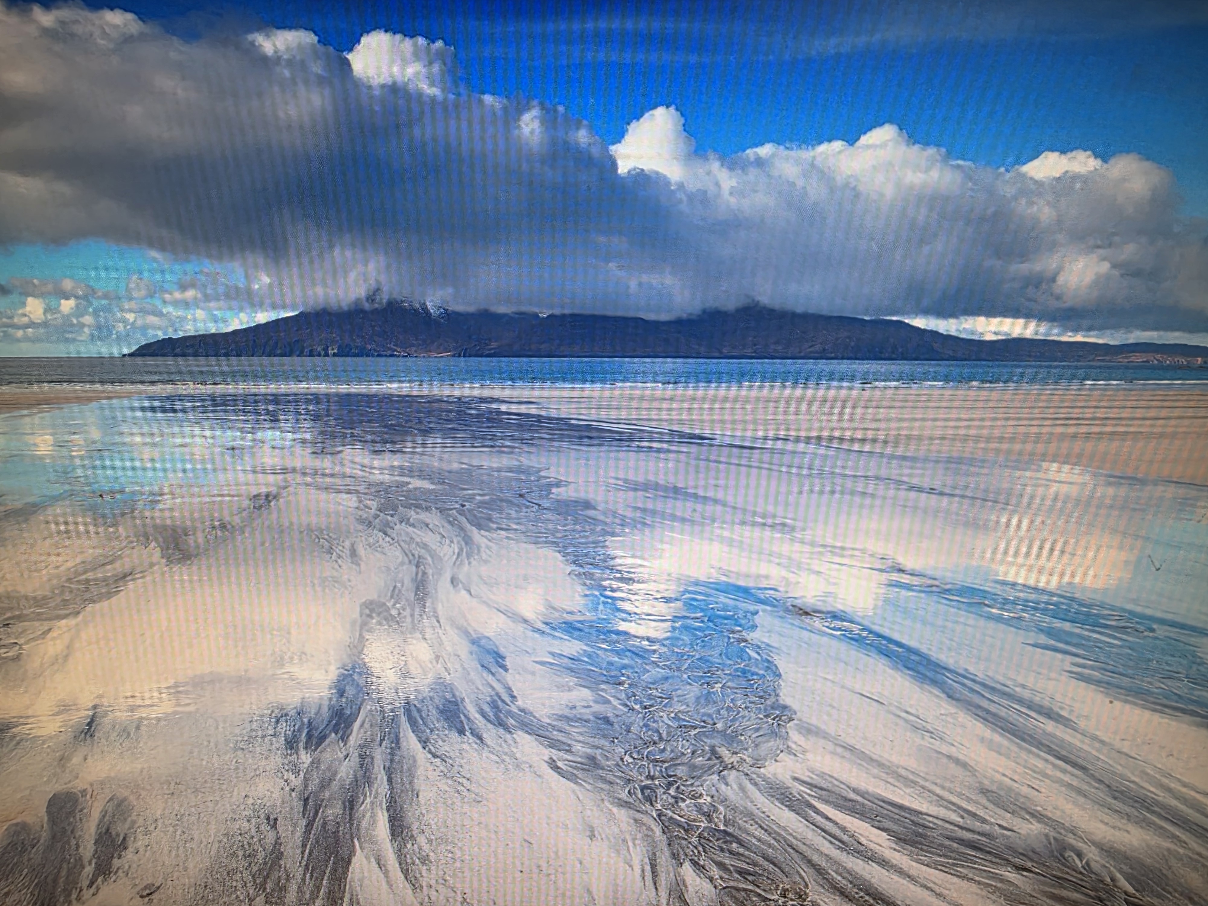 라익 만의 풍경을 완성하는 또 다른 요소는 바로 맞은편에 보이는 거대한 섬, **럼 섬(Isle of Rùm)**입니다. 안개에 휩싸인 듯 신비로운 럼 섬의 웅장한 산맥은 라익 만의 잔잔한 물결과 대비되어 더욱 극적인 경관을 만들어냅니다. 라익 만은 이그 섬의 다른 해변들보다 조용하고 한적하여, 고독한 아름다움 속에서 사색을 즐기기에도 완벽한 장소입니다. 이그 섬은 자동차가 없어 이동이 제한적이기 때문에, 라익 만에 방문하려면 자전거나 도보를 이용해야 합니다. 이러한 불편함 덕분에 라익 만은 그 순수한 자연의 모습을 고스란히 간직할 수 있었습니다.