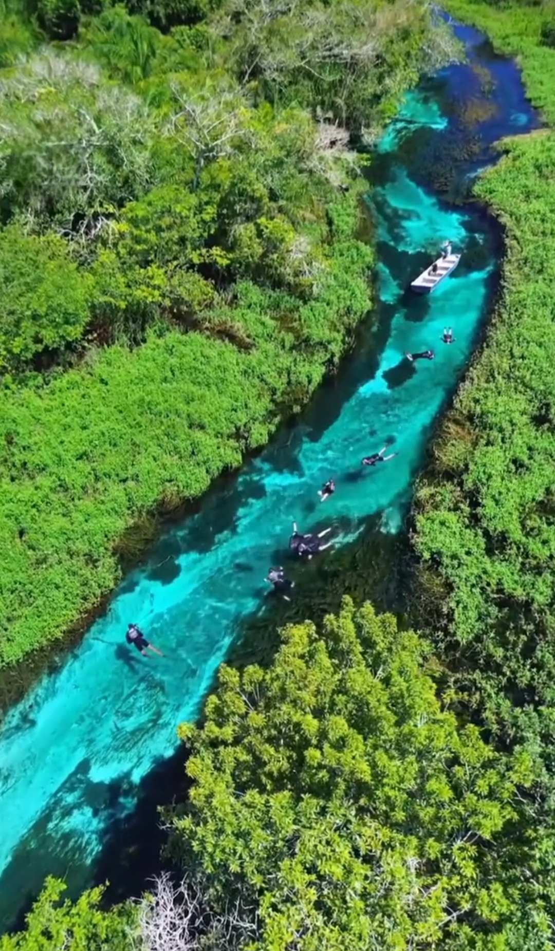 이 강의 물이 이토록 투명한 이유는 강물이 석회암 지대를 통과하며 흐르기 때문입니다. 석회암에 함유된 탄산칼슘 성분이 물속의 부유물을 침전시켜 자연스럽게 필터 역할을 합니다. 이로 인해 강물의 시야는 무려 40m에 달할 정도로 압도적인 투명도를 자랑합니다. 마치 거대한 수족관 속을 유영하는 듯한 기분을 느낄 수 있습니다.