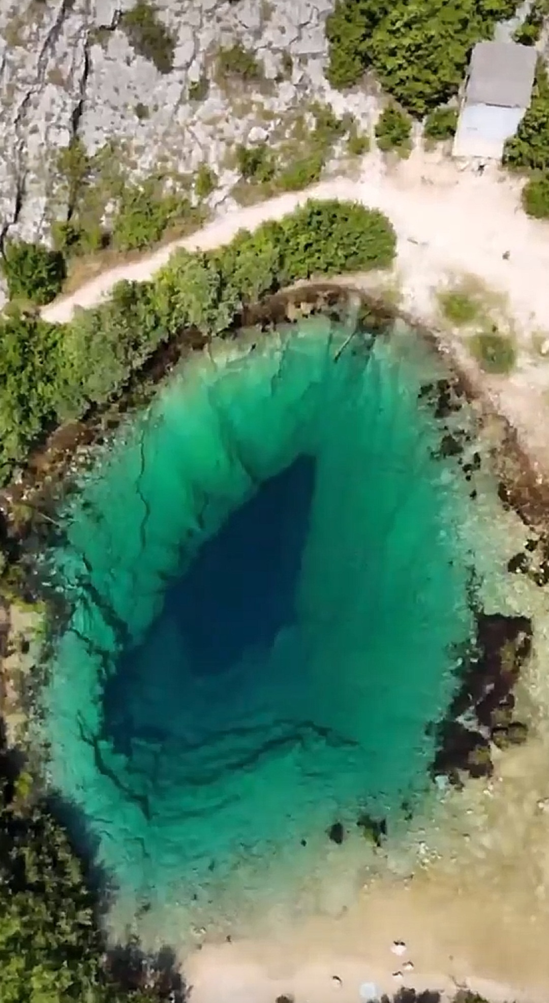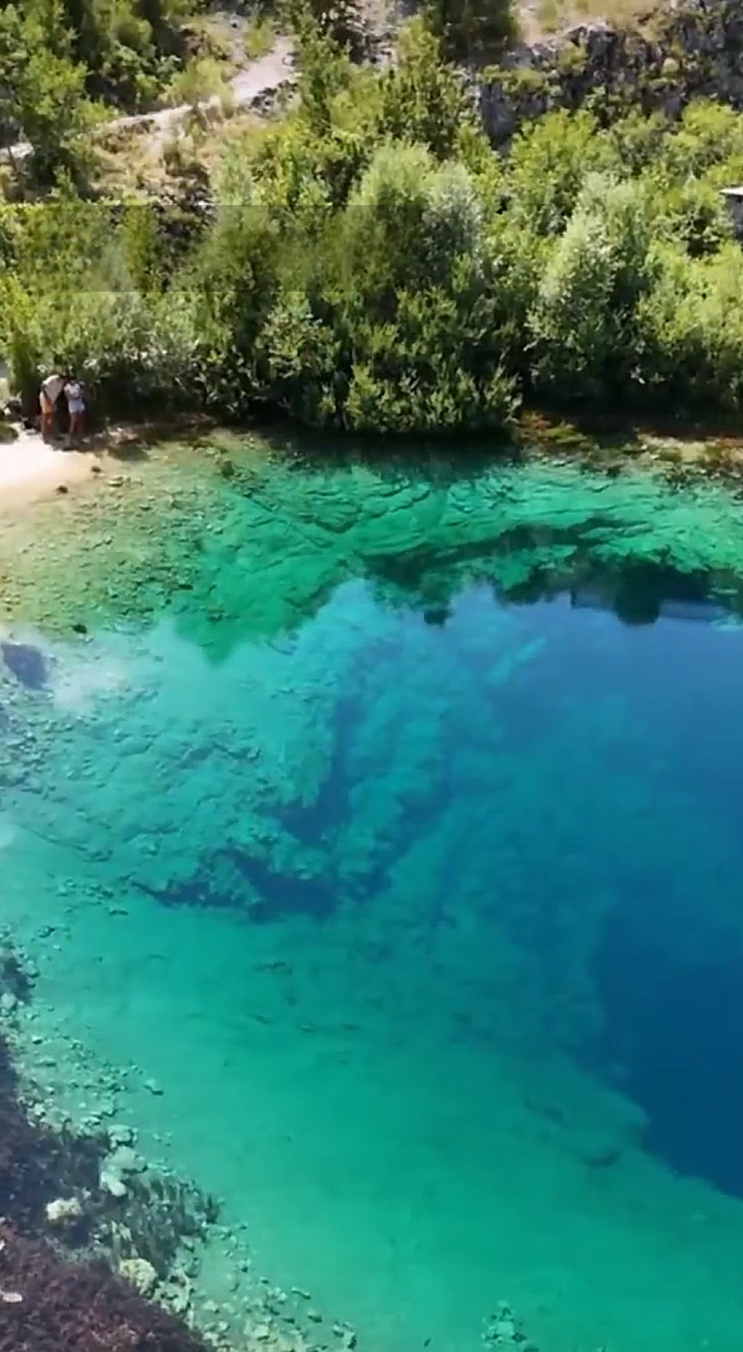 2. 에메랄드빛 눈동자: '지구의 눈'이라는 별명은 이 샘을 공중에서 내려다보았을 때 가장 명확하게 이해됩니다. 원형의 샘물은 중앙은 깊고 어두운 남색을 띠고, 가장자리는 햇빛에 반사되어 밝은 청록색과 에메랄드 녹색을 띠는데, 이 모습이 영락없이 푸른 홍채를 가진 거대한 눈과 같습니다. 맑고 투명한 물은 시야가 매우 뛰어나 수심 수십 미터 아래의 석회암 구조까지 육안으로 볼 수 있습니다.