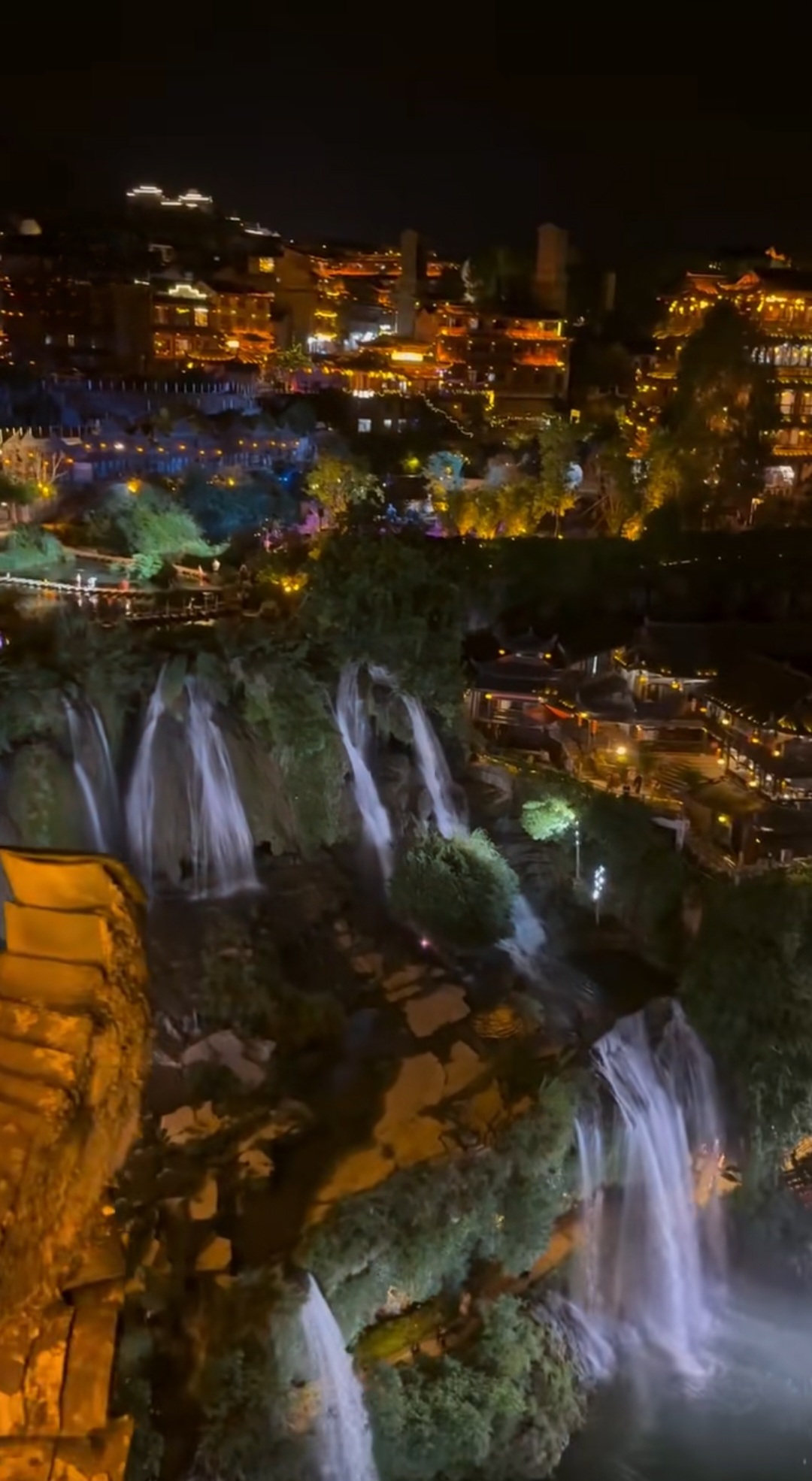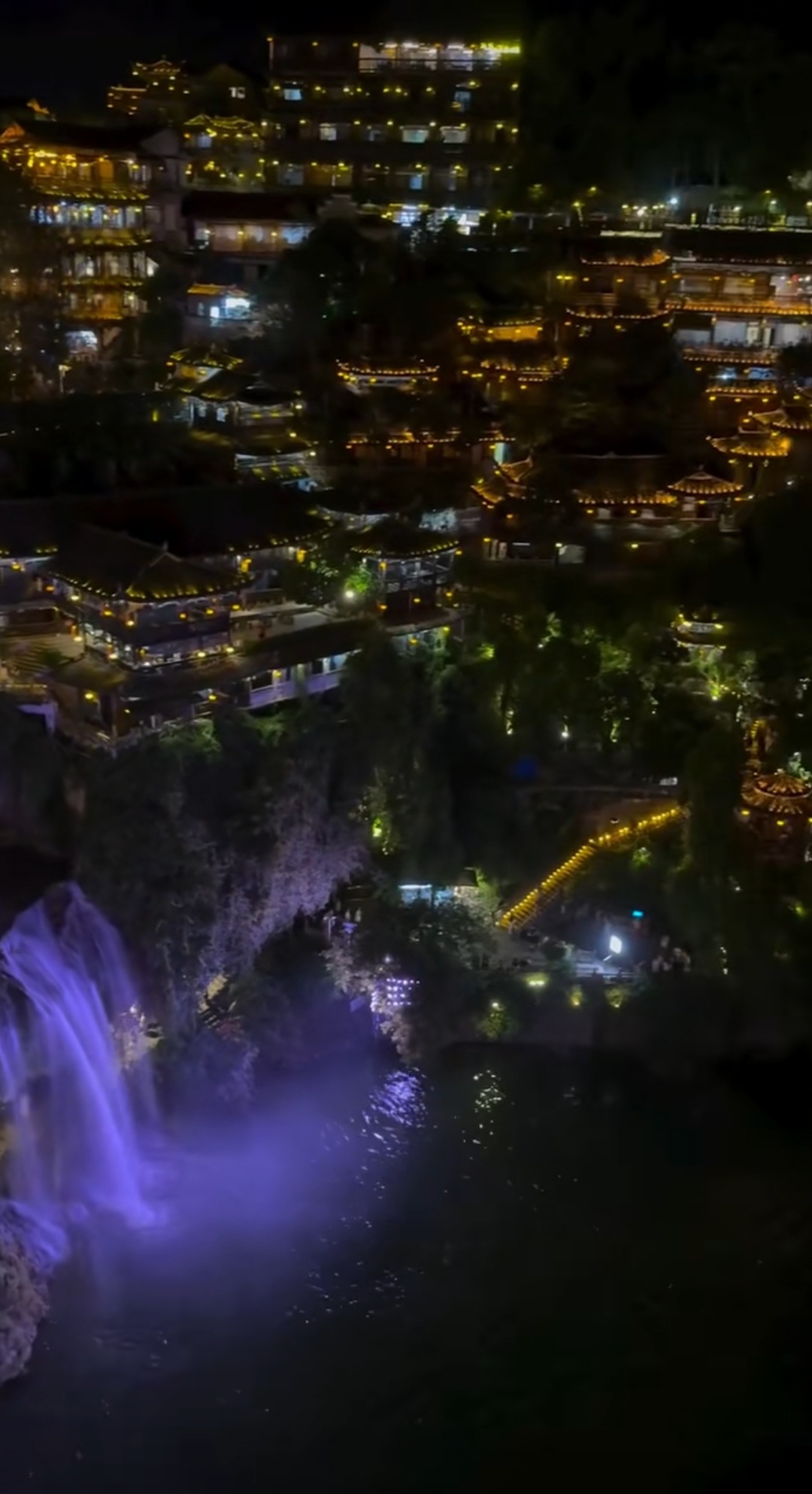 푸롱 고대 도시의 낮이 웅장한 자연의 아름다움을 뽐낸다면, 밤은 더욱 환상적인 분위기를 연출합니다. 해가 지고 도시의 곳곳에 조명이 켜지면, 폭포와 투쟈족의 전통 건축물들이 빛으로 물들기 시작합니다. 특히 폭포 아래로 쏟아지는 물줄기에 비추는 조명은 신비로운 분위기를 더하며, 폭포 위에 지어진 고대 도시가 마치 밤하늘에 떠 있는 것처럼 보입니다. 고성 곳곳의 홍등과 조명이 어우러져 만들어내는 야경은 낮과는 또 다른 매력을 뿜어내며, 여행객들에게 로맨틱하고 몽환적인 감동을 선사합니다.