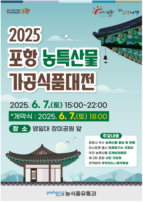 - 내용: 포항의 우수한 농특산물과 가공식품을 한자리에서 만나볼 수 있는 행사입니다. 시식 체험, 요리 시연, 시민가요제 등 다양한 프로그램이 마련되어 있으며, 지역 농업의 가치를 알리고 소비자와의 소통을 강화하는 장입니다.